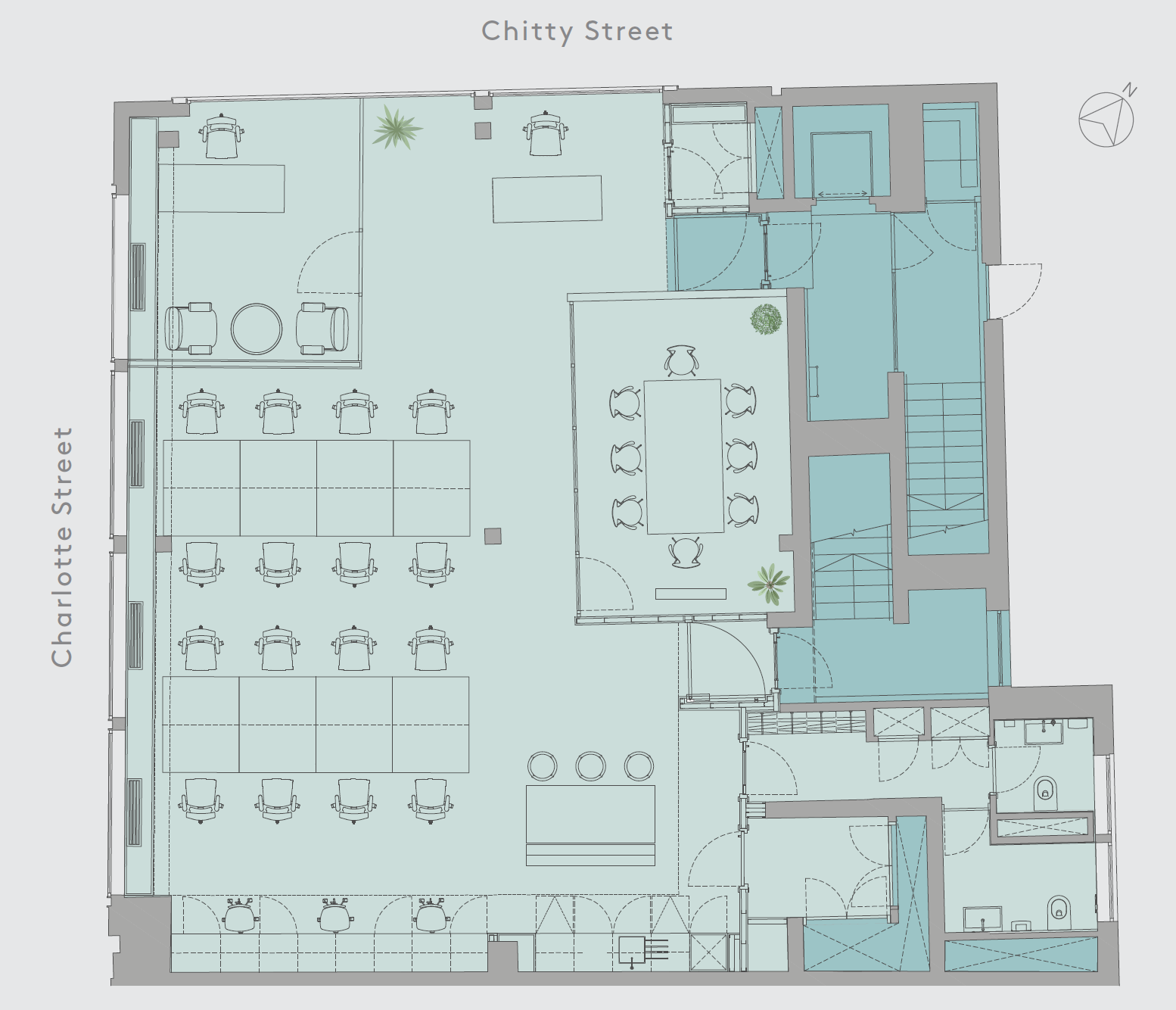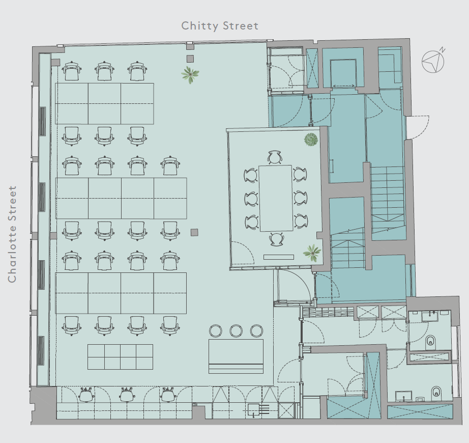 Charlotte Studios occupies a prominent corner position on Charlotte Street and Chitty Street, directly opposite our member’s amenity space DL/78 in Fitzrovia W1.